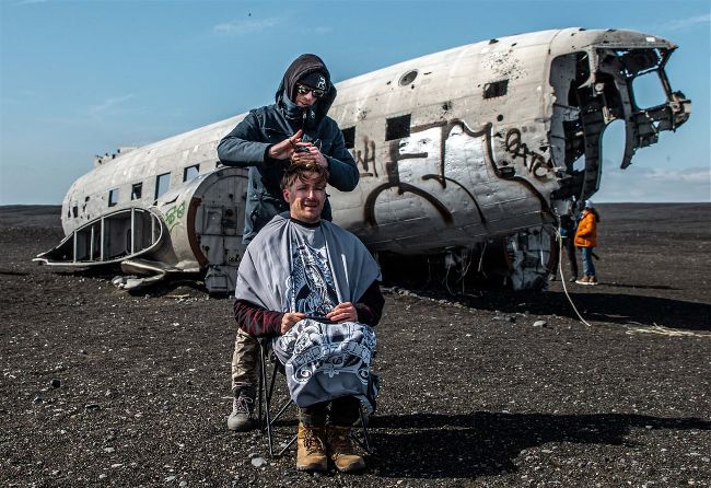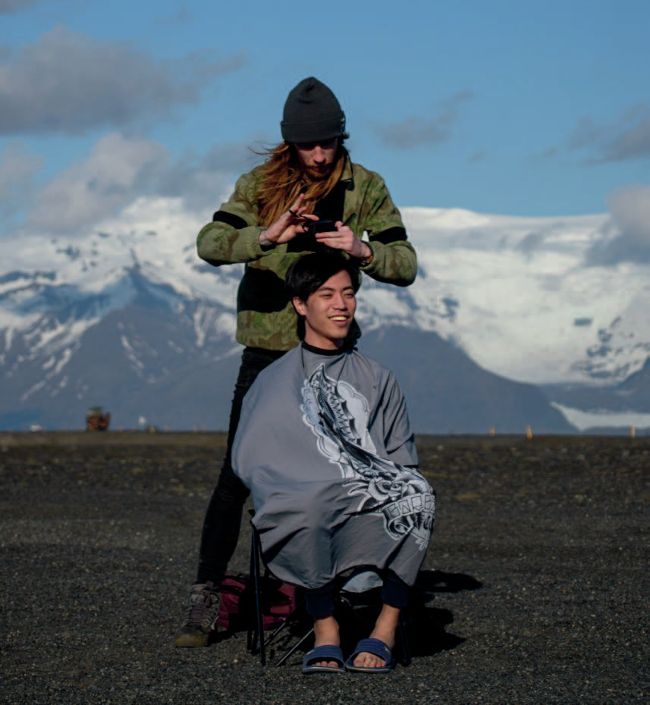 My favourite place that I’ve ever cut hair was at a secret waterfall in Iceland. It was hard to get to, plus I had a small chair strapped to my front. We had to go over stepping stones that were wobbly, make a leap of faith over water, cross a snowy canyon – you get the picture. I actually dropped the chair in some water, and my poor friend sat on a wet chair. After the haircut we got back to the van and I realised I left something behind. The friend came back with me – and he fell in. The experiences that I get to have are mad. I will say that cutting hair in -15°C is not that easy. You lose feeling in your hands, instead you have to follow the sound of the haircut. I actually did a blind folded haircut once (it wasn’t my best work…)
